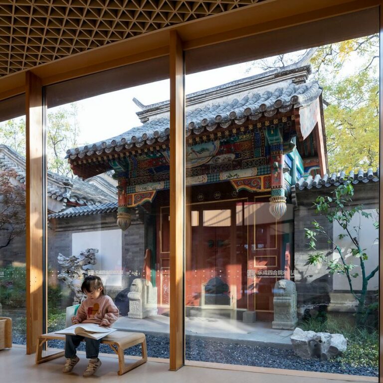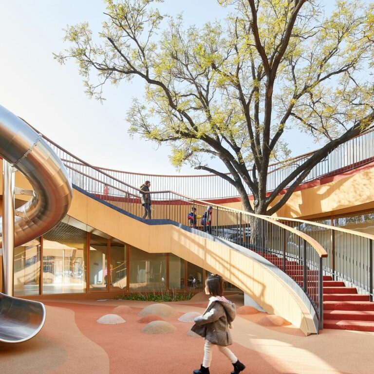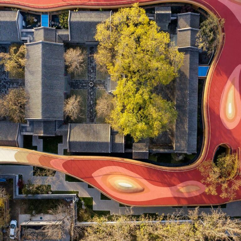 В Пекине построен современный детский сад, который «обвивает» внутренний двор 18-го века. Это позволяет сохранить культурное наследие старинного дворика, сформировав многослойное городское пространство, в котором сосуществуют старое и новое. Главной особенностью здания является волнистая крыша ярко-оранжевого цвета, которая заполняет пространство между старыми постройками. Такое необычное решение предоставляет детям удивительное и безопасное пространство для игр, занятий спортом на открытом воздухе.