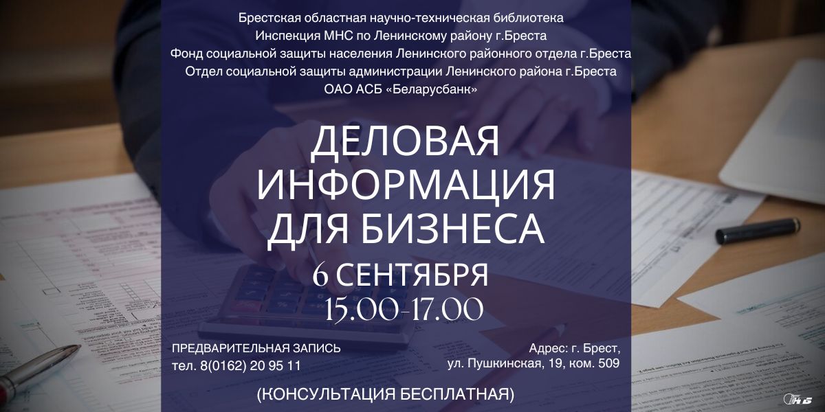 06 сентября 2024 года с 15.00 до 17.00 часов в Брестской областной научно-технической библиотеке в рамках проекта «Деловая информация для бизнеса» состоится встреча со специалистами инспекции МНС по Ленинскому району г. Бреста, фонда социальной защиты населения Ленинского районного отдела г. Бреста, отдела социальной защиты администрации Ленинского района г. Бреста и ОАО АСБ «Беларусбанк».