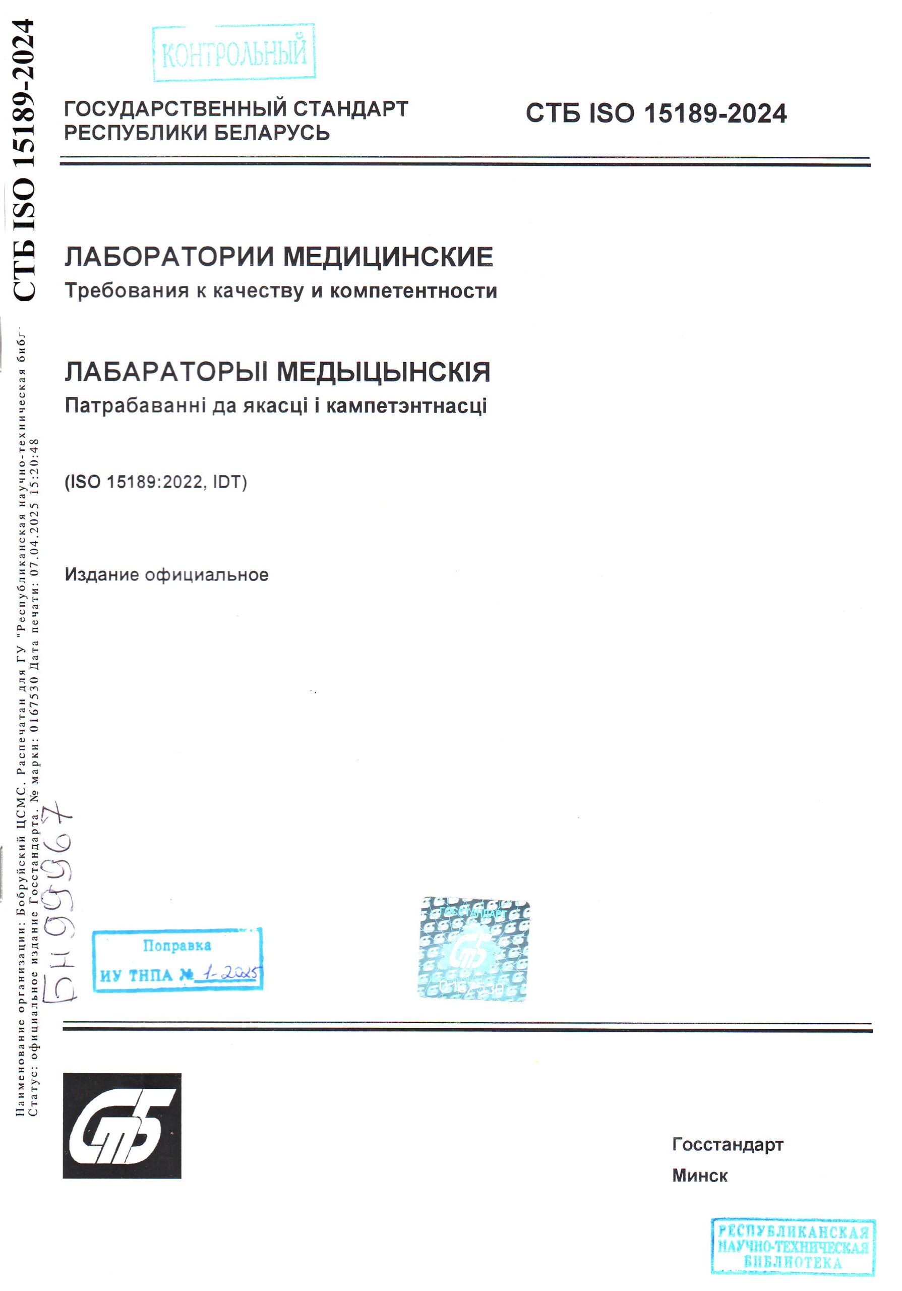 Стандарт идентичен международному стандарту ISO 15189:2022 «Лаборатории медицинские. Требования к качеству и компетентности» и введен в действие с 1 декабря 2024 г. взамен СТБ ISO 15189-2015.