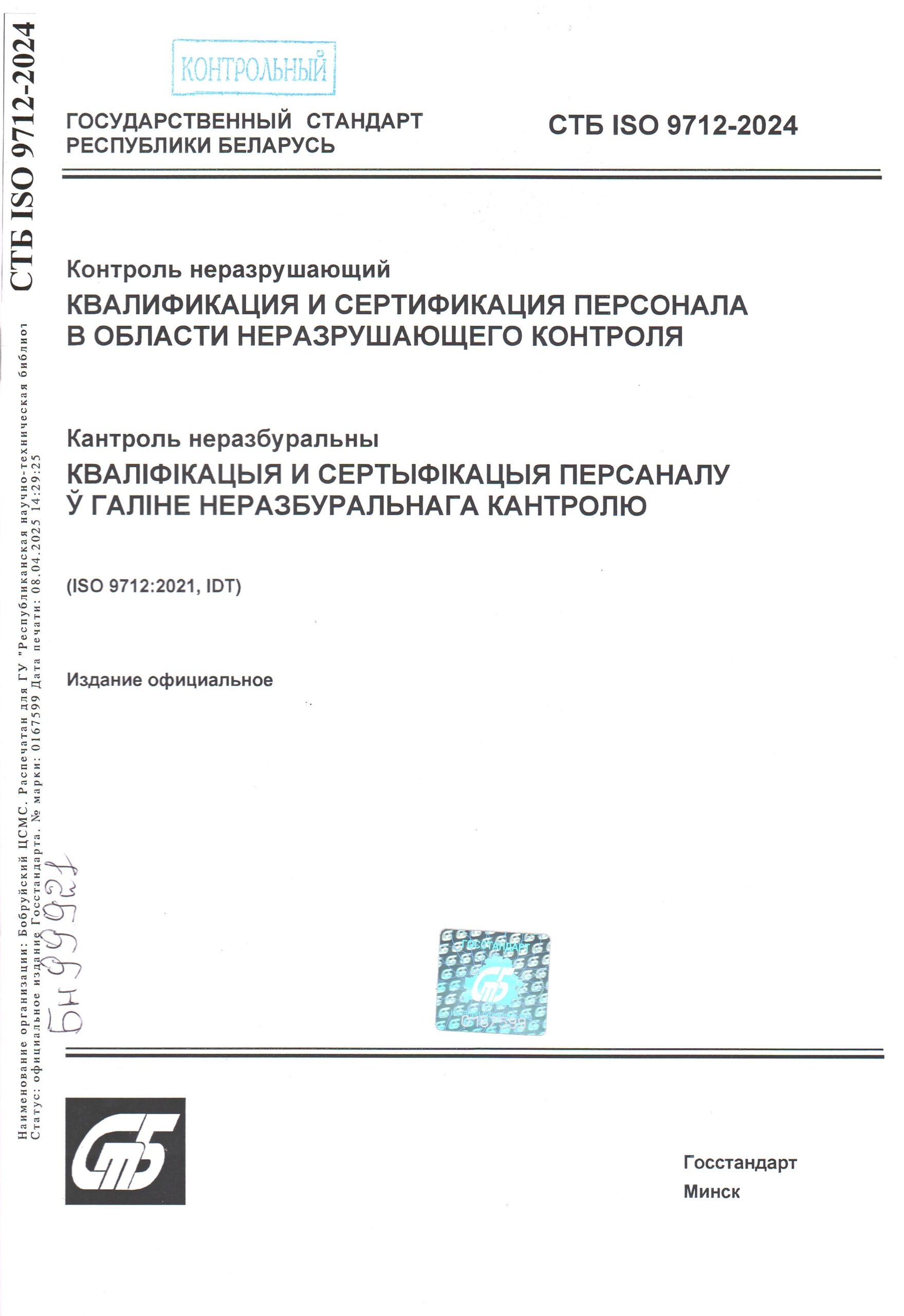 Стандарт недели. СТБ ISO 9712-2024. Контроль неразрушающий. Квалификация и сертификация персонала в области неразрушающего контроля