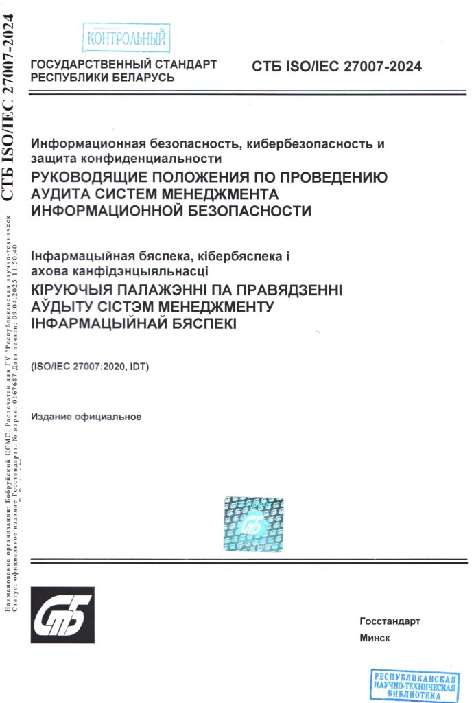 Стандарт идентичен международному стандарту ISO/IEC 27007:2020 «Информационная безопасность, кибербезопасность и защита конфиденциальности. Руководящие положения по проведению аудита систем менеджмента информационной безопасности» и введён в действие с 1 января 2025 г.
